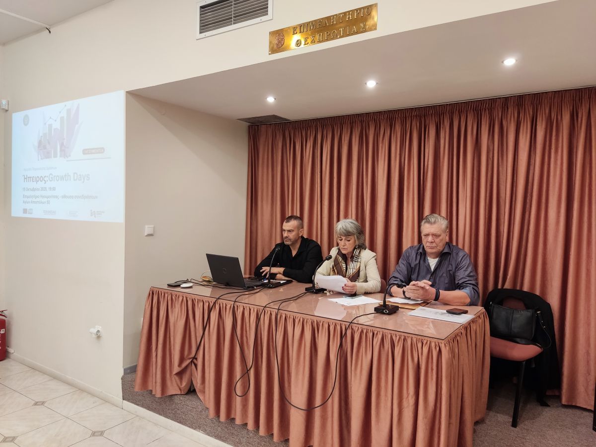 Στην Εκδήλωση απηύθυναν χαιρετισμό ο Αντιπεριφερειάρχης Π.Ε. Θεσπρωτίας κ. Θωμάς Πιτούλης, η Προϊσταμένη της ΕΥΔ Ηπείρου κα Ευγενία Παπανικολάου και ο Πρόεδρος του Επιμελητηρίου κ. Αντώνιος Νικολάου.