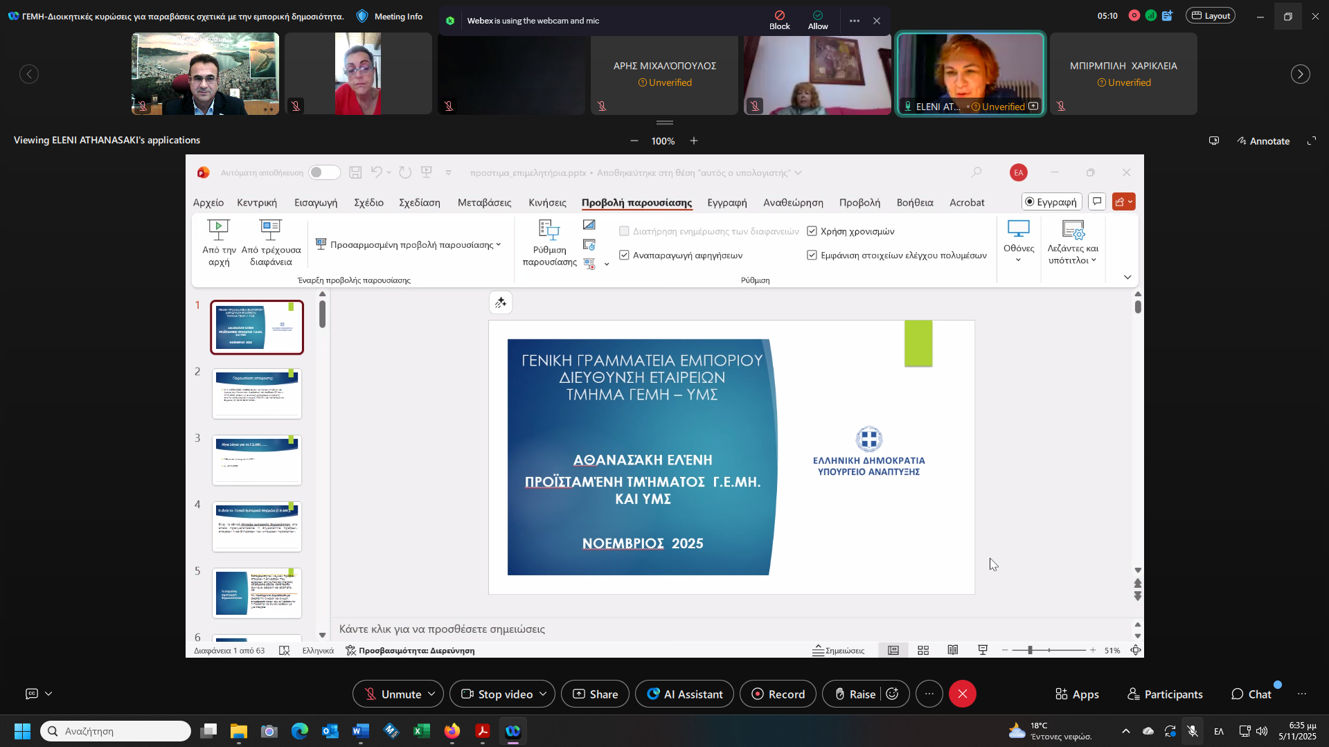 Αναπτύχθηκε η ΚΥΑ 46982/2025 (ΦΕΚ 3542/Β/08.07.2025), παρουσιάσθηκε η διαδικασία ενημέρωσης των υπόχρεων και όλα τα βήματα πριν την τελική κατάληξη επιβολής του προστίμου ανά κατηγορία επιχείρησης και ανά περίπτωση, τονίσθηκε ότι το μέτρο επιβολής διοικητικών κυρώσεων που είχε προβλεφθεί από τον Ν.3419/2005 καθυστέρησε προκειμένου να υπάρχει ικανό διάστημα προσαρμογής στα νέα δεδομένα και κάλυψης των εκκρεμοτήτων τους και κοινή επιδίωξη δεν αποτελεί η τιμωρία, αλλά η εναρμόνιση των υπόχρεων με τις απαιτήσεις επιχειρηματικής δημοσιότητας και η διασφάλιση λειτουργίας ενός έγκυρου Μητρώου τήρησης και προβολής της Ελληνικής επιχειρηματικότητας, απαλλαγμένου από λάθη και παραλείψεις. Με το πέρας της παρουσίασης ακολούθησε διαλογική συζήτηση και απαντήθηκαν ερωτήσεις.