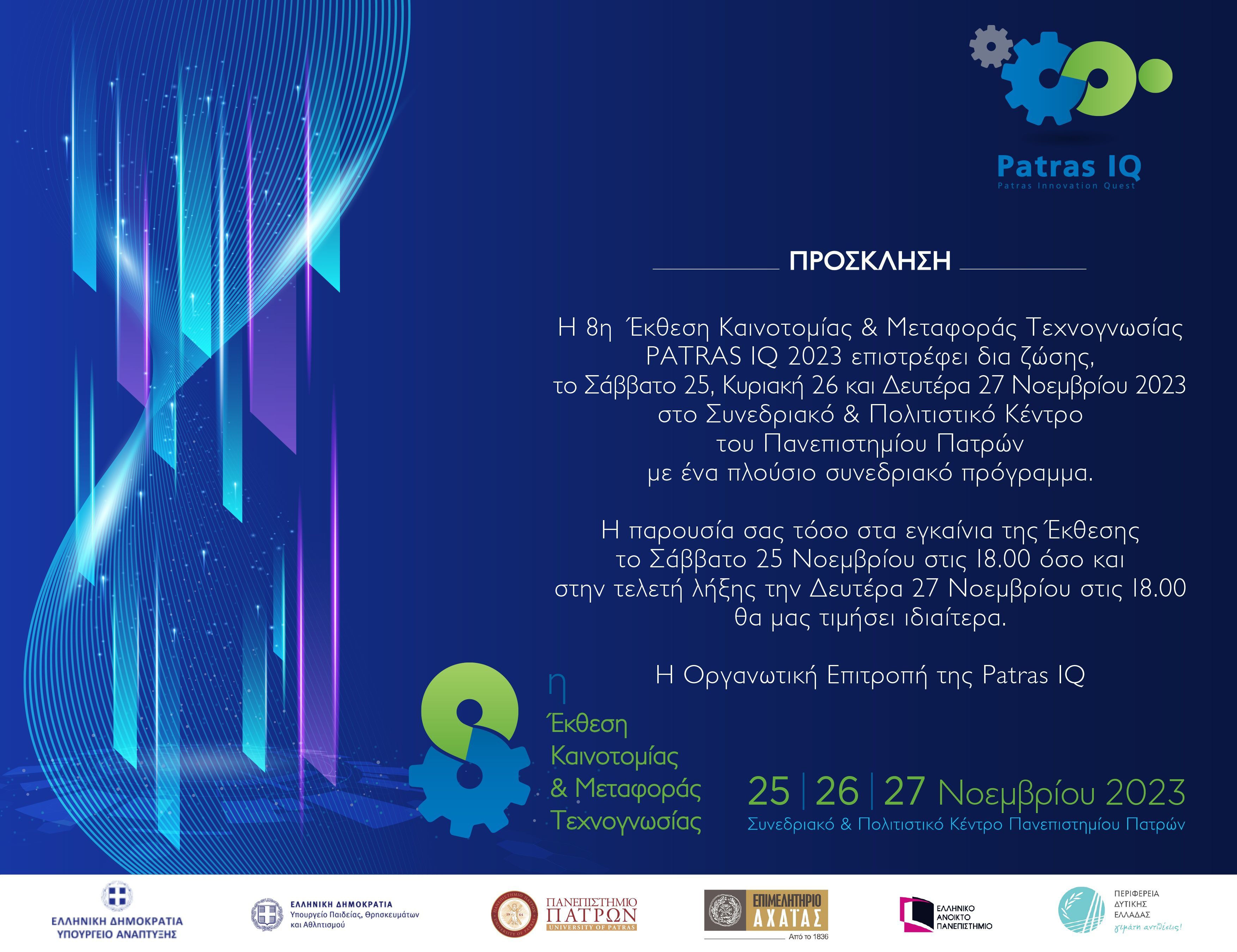8η Έκθεση Καινοτομίας & Μεταφοράς Τεχνογνωσίας PATRAS IQ 2023_Συνεδριακό & Πολιτιστικό Κέντρο του Πανεπιστημίου Πατρών_25 - 27.11.2023