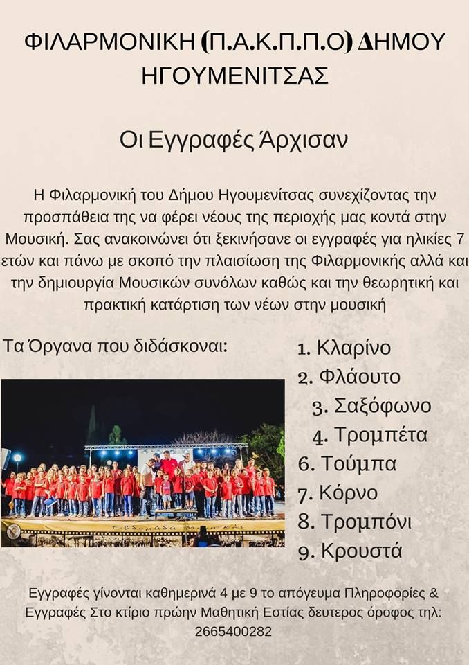 Η Φιλαρμονική Δήμου Ηγουμενίτσας συνεχίζοντας την προσπάθεια της να φέρει νέους της περιοχής μας κοντά στην Μουσική σας ανακοινώνει ότι ξεκινήσανε οι εγγραφές για ηλικίες 7 ετών και πάνω με σκοπό την πλαισίωση της Φιλαρμονικής αλλά και την δημιουργία Μουσικών συνόλων καθώς και την θεωρητική και πρακτική κατάρτιση των νέων στην μουσική.