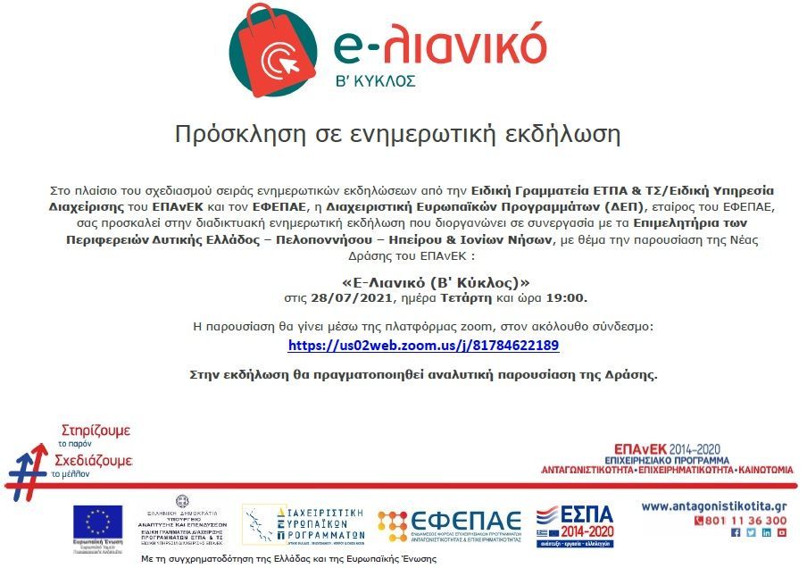 Ενημερωτική εκδήλωση για την δράση E-ΛΙΑΝΙΚΟ (Β ΚΥΚΛΟΣ)_Τετάρτη 28.07.2021 μέσω τηλεδιάσκεψης.