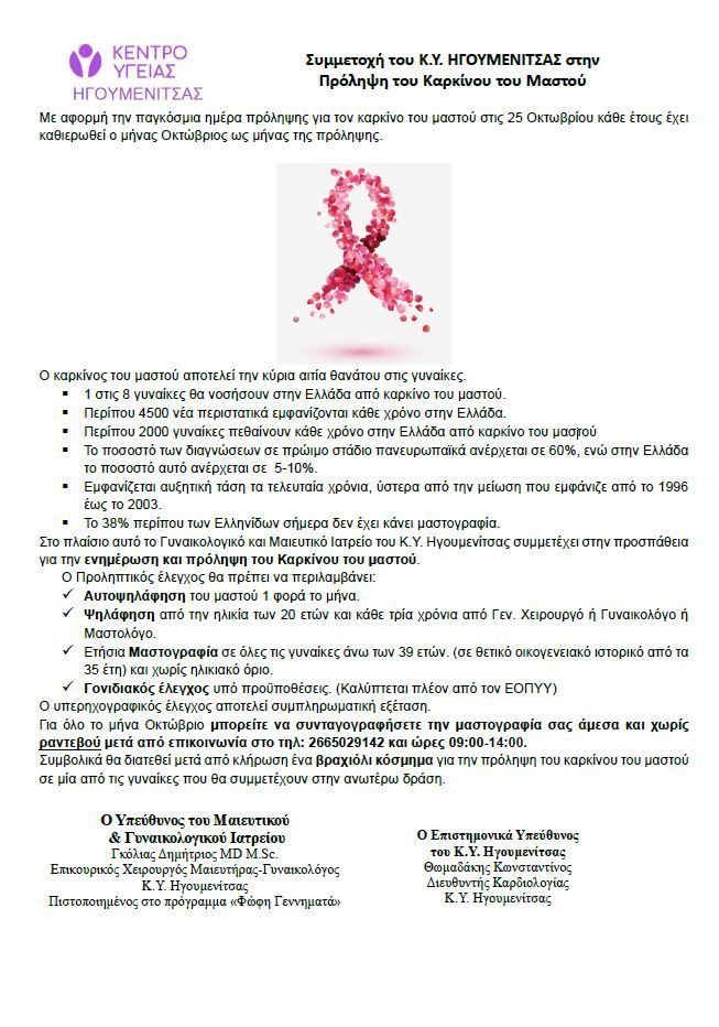 Συμμετοχή του Κ.Υ. ΗΓΟΥΜΕΝΙΤΣΑΣ στην Πρόληψη του Καρκίνου του Μαστού