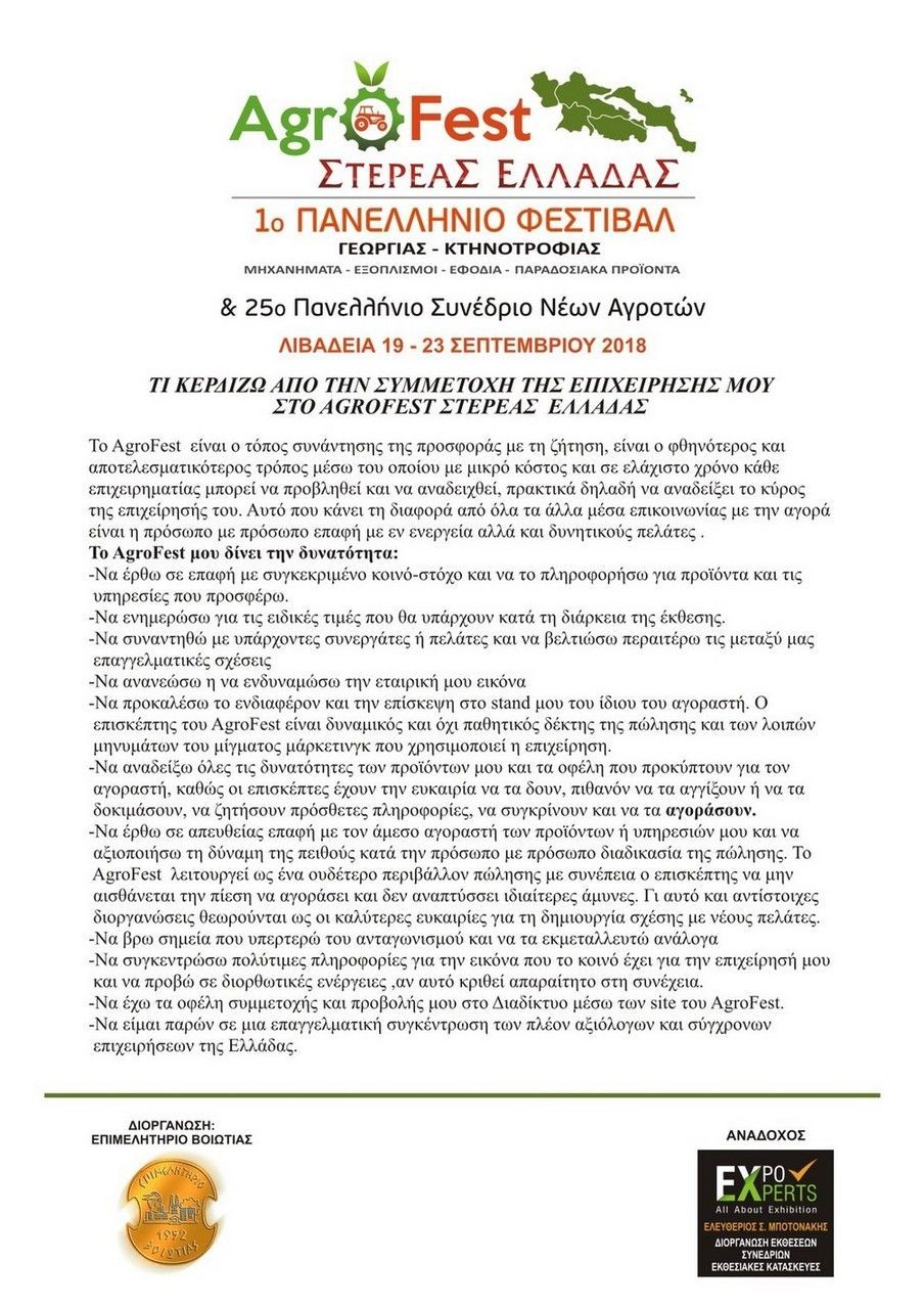 1ο Πανελλήνιο Φεστιβάλ Γεωργίας & Κτηνοτροφίας, AGROfest Στερεάς Ελλάδας_Λιβαδειά_19-23.09.2018