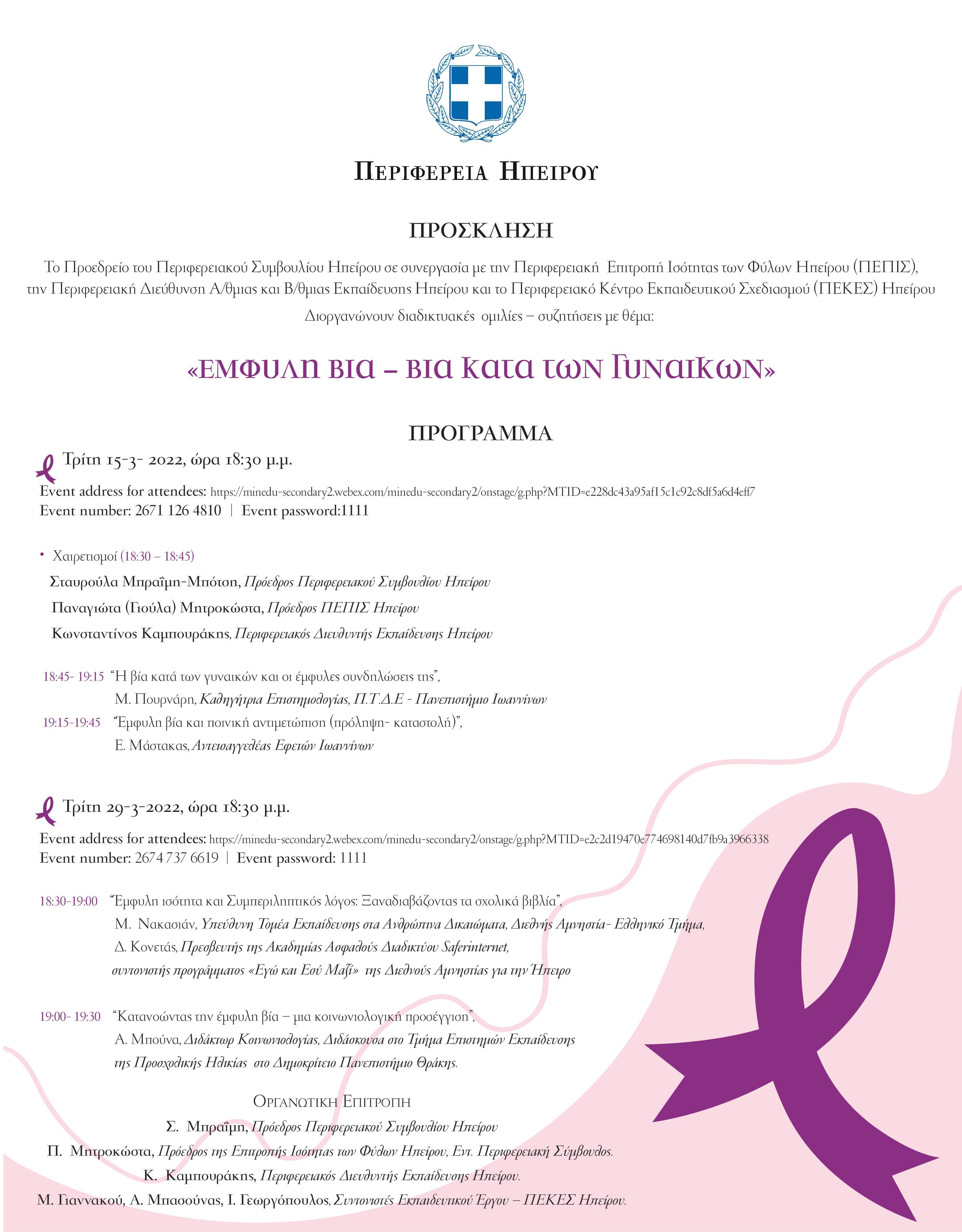Περιφέρεια Ηπείρου_Διαδικτυακές ομιλίες – συζητήσεις με θέμα: Έμφυλη Βία – Βία κατά των Γυναικών_15.03.2022