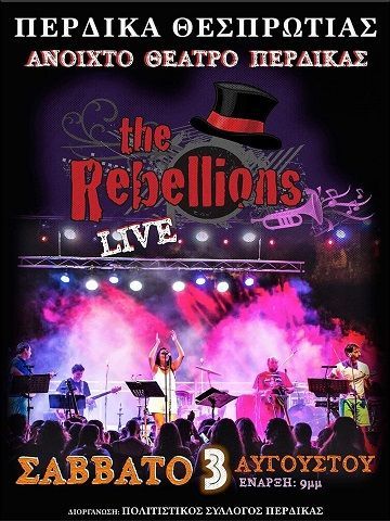 -Σάββατο 03-08-2019 μουσική συναυλία από τους «Rebellions» που διοργανώνει ο Πολιτιστικός και Επιμορφωτικός Σύλλογος Πέρδικας, στο αμφιθέατρο Πέρδικας, στις 21:00 με είσοδο 5€.