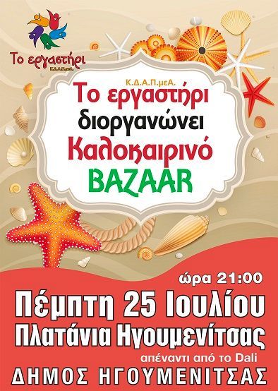 - Πέμπτη 25-07-2019 και ώρα 21:00 το Κ.Δ.Α.Π. μεΑ «το Εργαστήρι» διοργανώνει Καλοκαιρινό Bazzarστα πλατάνια Ηγουμενίτσας