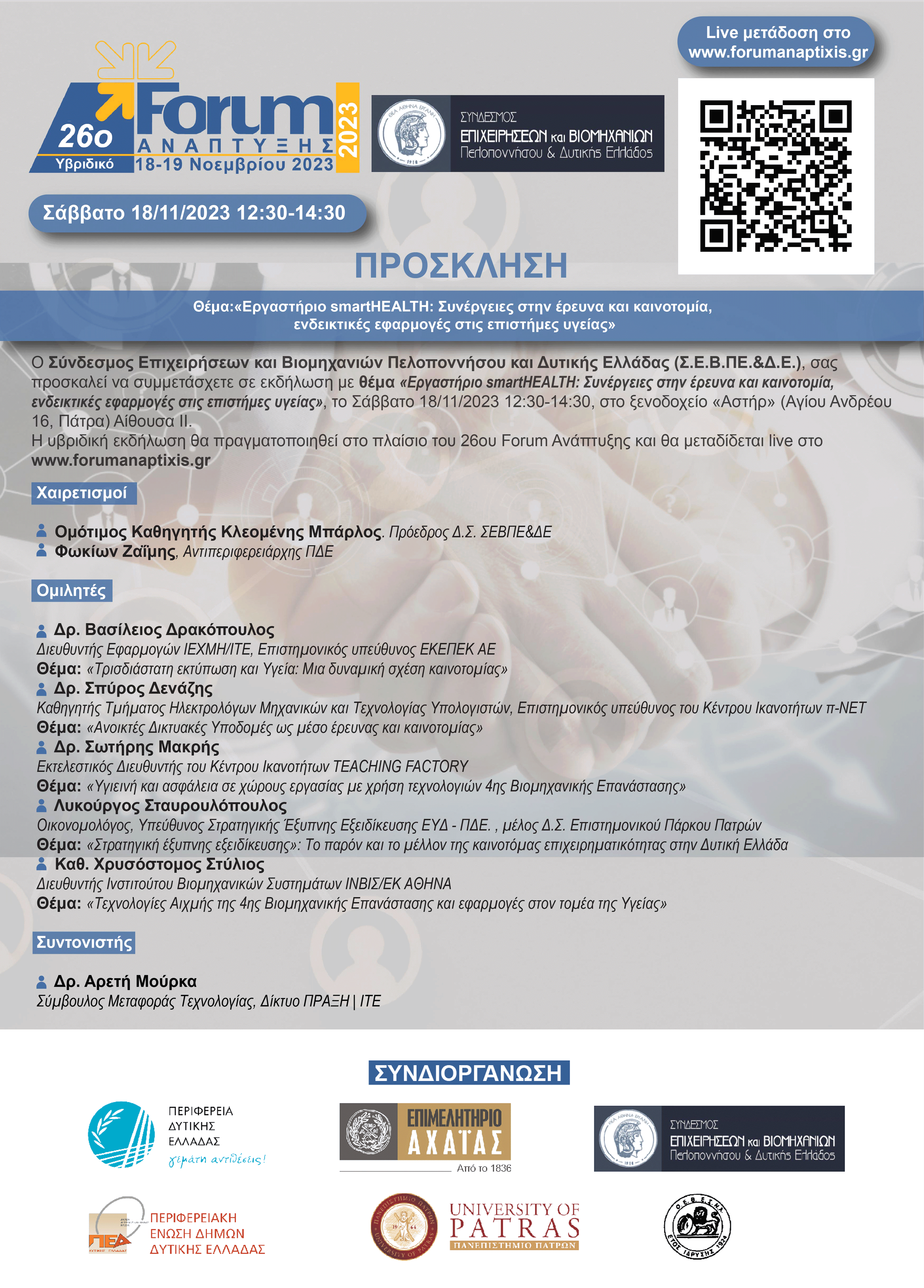 Δείτε πατώντας εδώ την πρόσκληση για το 26ο FORUM ΑΝΑΠΤΥΞΗΣ που οργανώνει ο Σύνδεσμός Επιχειρήσεων και Βιομηχανιών Πελοποννήσου & Δυτικής Ελλάδος, με θέμα: «Εργαστήριο smartHEALTH: Συνέργειες στην έρευνα και καινοτομία, ενδεικτικές εφαρμογές στις επιστήμες υγείας» το Σάββατο 18 Νοεμβρίου 2023 και ώρα 12:30 – 14:30 στο ξενοδοχείο «Αστήρ» (Αγίου Ανδρέου 16, Πάτρα) Αίθουσα ΙΙ.