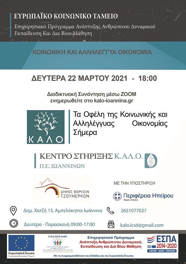 Κέντρο Στήριξης ΚΑΛΟ ΠΕ Ιωαννίνων_Εκδήλωση: Τα οφέλη της Κοινωνικής & Αλληλέγγυας Οικονομίας σήμερα_22.03.2021