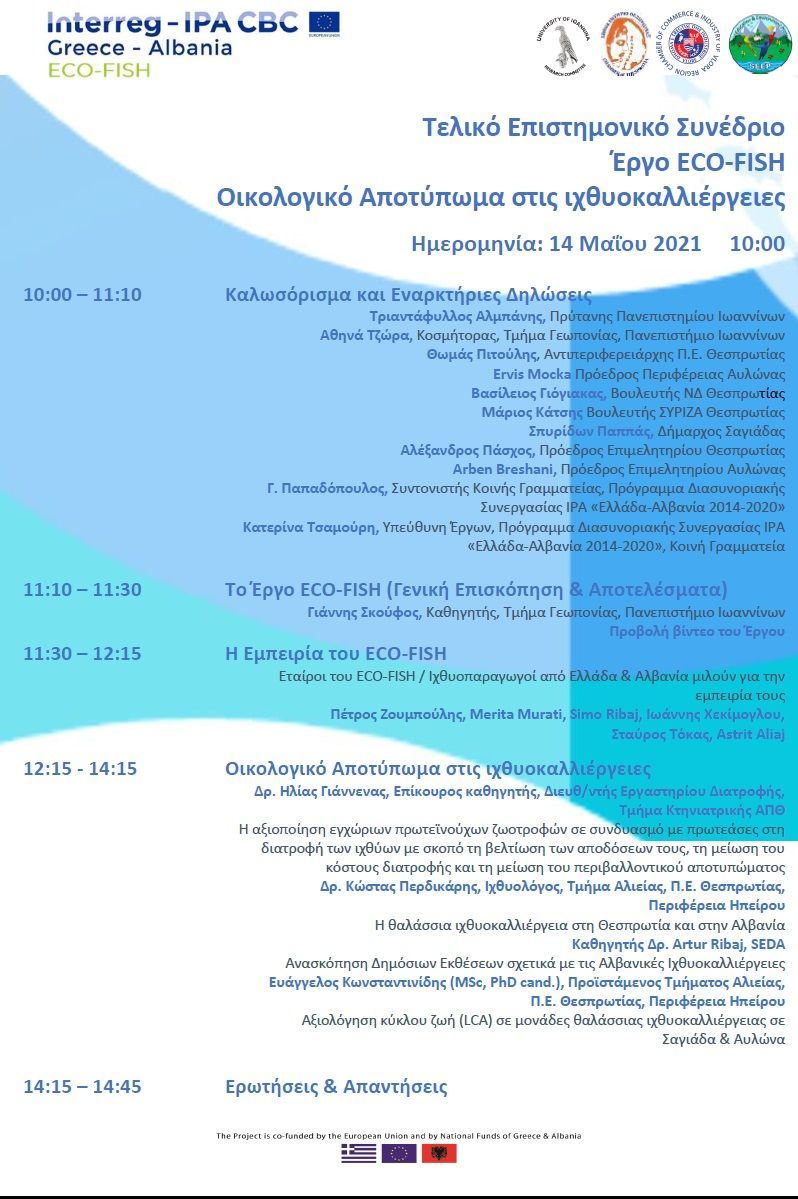 ECO FISH_Τελικό Επιστημονικό Συνέδριο (τηλεδιάσκεψη) παρουσίασης αποτελεσμάτων του έργου, και προτεινόμενων εφαρμογών μείωσης περιβαλλοντικού αποτυπώματος στις ιχθυοκαλλιέργειες_14.05.2021 και ώρα 10:00