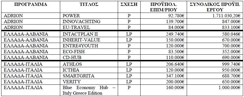 11) Στα διακρατικά προγράμματα ADRION, ΕΛΛΑΔΑ ΑΛΒΑΝΙΑ & ΕΛΛΑΔΑ ΙΤΑΛΙΑ συμμετείχαμε με 14 προτάσεις που υποβλήθηκαν το έτος 2016 ως Επικεφαλής Εταίροι κι ως Εταίροι. Δυστυχώς, εξ αυτών εγκρίθηκε μόνο μία πρόταση στο Ελλάδα – Αλβανία το έργο ECO FISH, και μία στο πρόγραμμα ADRION το έργο POWER. Αναμένουμε ακόμη αποτελέσματα για μια πρόταση στο Ελλάδα- Ιταλία όπου υποβλήθηκε ένσταση. Στα έργα που συμμετείχαμε ως AssociatePartners εγκρίθηκε η πρόταση QNEST και αναμένουμε αποτελέσματα από την πρόταση MYTILFARM που υποβλήθηκαν στο έργο ADRION και MED αντίστοιχα.