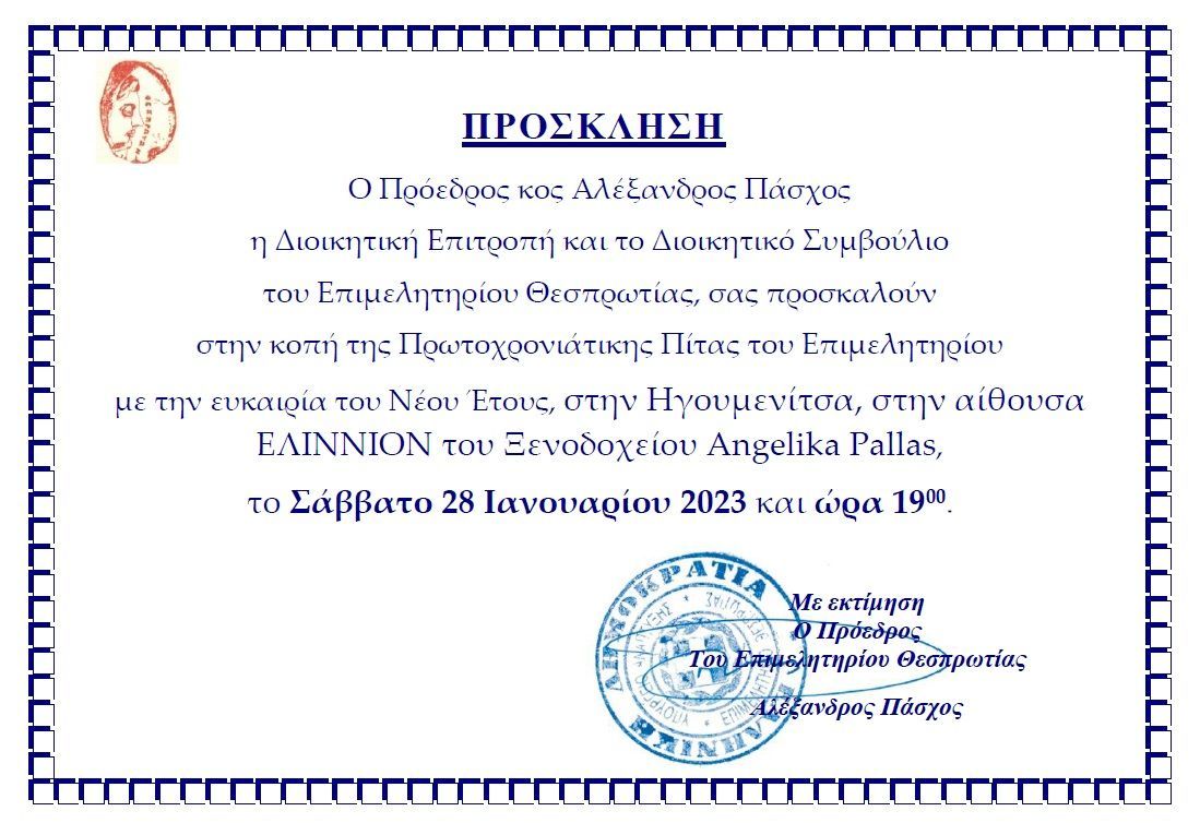 Πρόσκληση στην κοπή της Πρωτοχρονιάτικης Πίτας του Επιμελητηρίου_Αίθουσα ΕΛΙΝΝΙΟΝ Ξενοδοχείου Angelika Pallas, Ηγουμενίτσα_28.01.2023 και ώρα 19:00