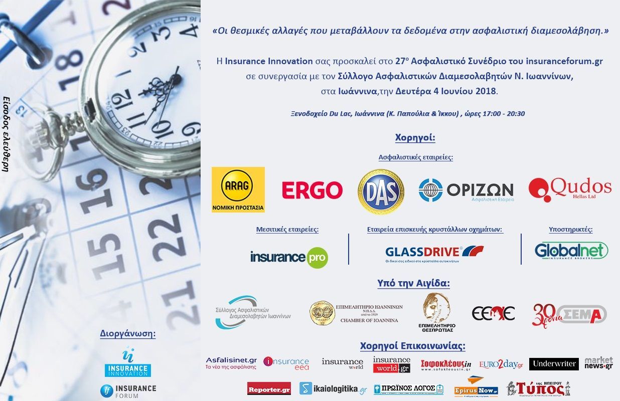 27ο Ασφαλιστικό Συνέδριο InsuranceForum.gr & Συλλόγου Ασφαλιστικών Διαμεσολαβητών Ν. Ιωαννίνων: Οι θεσμικές αλλαγές που μεταβάλλουν τα δεδομένα στην ασφαλιστική διαμεσολάβηση_Ξενοδοχείο Du Lac_04.06.2018
