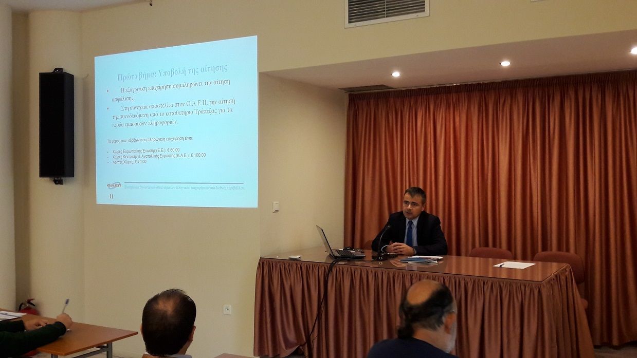 Χαιρετισμό απεύθυνε ο Πρόεδρος του Επιμελητηρίου κος Αλέξανδρος Πάσχος, ενώ ομιλητής της εκδήλωσης ήταν ο Αναπληρωτής Γενικός Διευθυντής του Οργανισμού Ασφάλισης Εξαγωγικών Πιστώσεων, κος Κώστας Παπαπαναγιώτου.