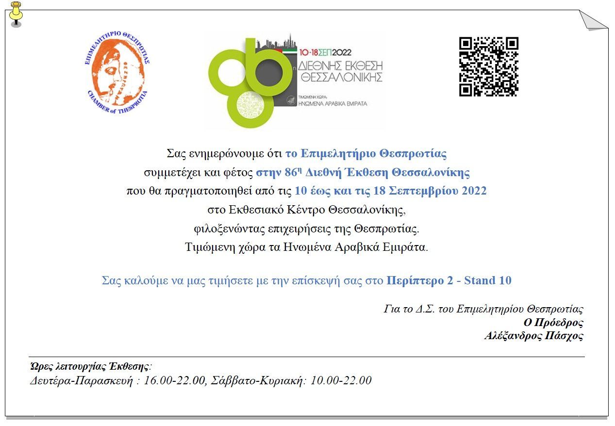 Πρόσκληση επίσκεψης περιπτέρου Επιμελητηρίου Θεσπρωτίας στην 86η ΔΕΘ_10-18.09.2022