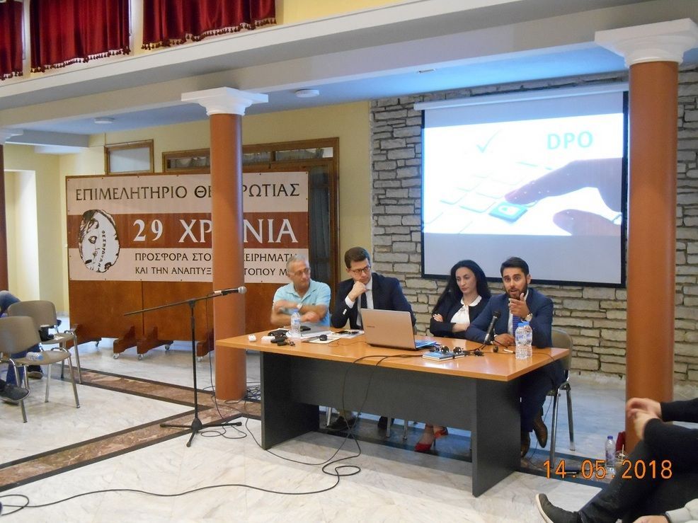 Το Επιμελητήριο Θεσπρωτίας στην προσπάθεια του για έγκυρη ενημέρωση και προετοιμασία των μελών του στα νέα δεδομένα και την καλύτερη προσαρμογή τους στο Νέο Κανονισμό για την Προστασία Προσωπικών Δεδομένων «GDPR», υλοποίησε ενημερωτική ημερίδα σε συνεργασία με το Ελληνικό Ινστιτούτο Πιστοποιήσεων και το Διαβαλκανικό Κέντρο Επιχειρηματικής Ανάπτυξης, την Δευτέρα 14.05.2018 και ώρα 18:30 στο Πνευματικό Κέντρο Πάνθεον στην Ηγουμενίτσα.
