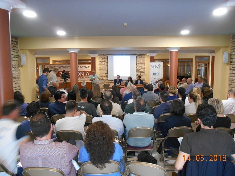Χαιρετισμό απεύθυνε ο Πρόεδρος του Επιμελητηρίου κος Πάσχος Αλέξανδρος ενώ ομιλητές της ημερίδας ήταν ο κος Άγγελος Τόλκας - Δικηγόρος, MSc Οικονομικού Δικαίου, Υπεύθυνος Διεπιμελητηριακού Φορέα Πιστοποίησης ο οποίος παρουσίασε «Τα νέα δεδομένα του Ευρωπαϊκού Κανονισμού για την Προστασία των Προσωπικών Δεδομένων», η κα Ελένη Διαφωνίδου, Νομικός, Ειδική συνεργάτης του Διαβαλκανικού Κέντρου Επιχειρηματικής Ανάπτυξης, η οποία παρουσίασε τον «Γενικό Κανονισμό: Αλλαγές και ευκαιρίες για τον επιχειρηματικό κόσμο», και ο κος Στέργιος Τζουβανίδης - Διευθύνων Σύμβουλος του Ελληνικού Ινστιτούτου Πιστοποιήσεων (ΕΛ.ΙΝ.Π), Ειδικός σε Θέματα Ασφάλειας Πληροφοριών ο οποίος παρουσίασε τον «Υπεύθυνο Προστασίας Δεδομένων (DPO): Απαιτήσεις, Ρόλος και Εφαρμογή - Η πιστοποίηση ως μέσο επίδειξης συμμόρφωσης».