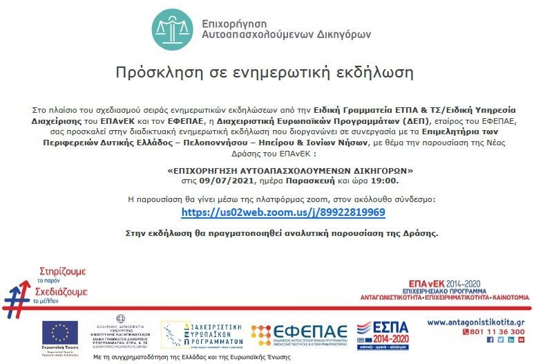 Ενημερωτική εκδήλωση για την δράση: «Επιχορήγηση Αυτοαπασχολούμενων Δικηγόρων»_Παρασκευή 09.07.2021 μέσω τηλεδιάσκεψης.