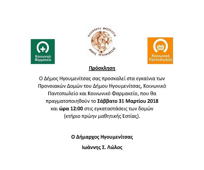 Δήμος Ηγουμενίτσας_Πρόσκληση στα εγκαίνια του Κοινωνικού Παντοπωλείου και Κοινωνικού Φαρμακείου_Κτήριο πρώην μαθητικής Εστίας_31.03.2018