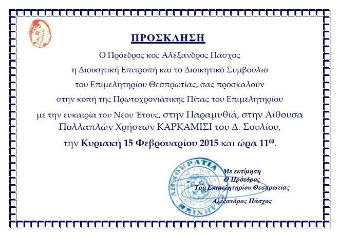 Πρόσκληση στην κοπή της Πρωτοχρονιάτικης Πίτας του Επιμελητηρίου Θεσπρωτίας με την ευκαιρία του Νέου Έτους, στην Παραμυθιά, στην Αίθουσα Πολλαπλών Χρήσεων ΚΑΡΚΑΜΙΣΙ του Δ. Σουλίου, την Κυριακή 15 Φεβρουαρίου 2015 και ώρα 1100.