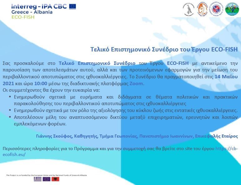 ECO FISH_Τελικό Επιστημονικό Συνέδριο (τηλεδιάσκεψη) παρουσίασης αποτελεσμάτων του έργου, και προτεινόμενων εφαρμογών μείωσης περιβαλλοντικού αποτυπώματος στις ιχθυοκαλλιέργειες_14.05.2021 και ώρα 10:00