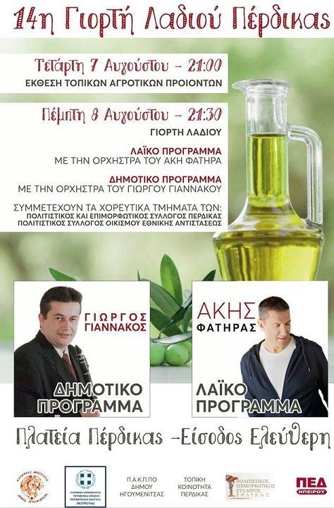 Ο Δήμος Ηγουμενίτσας, η Περιφερειακή Ενότητα Θεσπρωτίας, η Κοινότητα Πέρδικας και ο Πολιτιστικός και Επιμορφωτικός Σύλλογος Πέρδικας σας ενημερώνουν για το πρόγραμμα των εκδηλώσεων που θα πραγματοποιηθούν στην Πέρδικα: