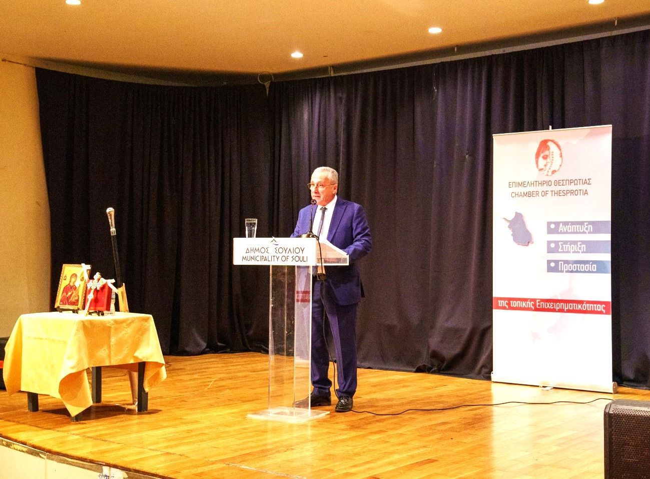 Αφού καλωσόρισε θεσμικά στην Θεσπρωτία τον Σεβασμιότατο Μητροπολίτη, αναφέρθηκε στην ομιλία του στα προβλήματα που αντιμετώπισε και αντιμετωπίζει η επιχειρηματική κοινότητα και η κοινωνία, επισημαίνοντας τις προκλήσεις που αντιμετωπίζει ο Νομός και οι επιχειρήσεις το νέο έτος, τις αστοχίες της Κεντρικής Διοίκησης που το νέο έτος πρέπει να επουλωθούν, όπως στο θέμα της επέκτασης της λειτουργίας του Τελωνείου Μαυροματίου,, τόσο για το ωράριο λειτουργίας, όσο και για τον εκτελωνισμό προϊόντων, η ολοκλήρωση της μελέτης του δρόμου σύνδεσης της Εγνατίας Οδού με τα Ελληνοαλβανικά σύνορα, η συνεργασία του νέου επενδυτή του λιμένα Ηγουμενίτσας σε ζωτικά αναπτυξιακά θέματα όπως η Μαρίνα, το Εμπορευματικό Κέντρο και η αξιοποίηση των τουριστικών καταφυγίων, η επίλυση των προβλημάτων των παραγωγών του πρωτογενούς τομέα, ο εξορθολογισμός των ασφαλιστικών εισφορών, η χρηματοδότηση από το τραπεζικό σύστημα, η προστασία των επιχειρήσεων και του παραγόμενου προϊόντος, από όπου κι αν αυτό προέρχεται, και τέλος η αναζωογόνηση της αγορά με την αναγκαία ενίσχυση της ρευστότητάς της.