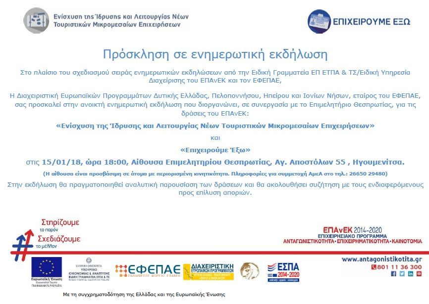 Πρόσκληση σε ενημερωτική εκδήλωση για τις δράσεις του ΕΠΑνΕΚ: Ενίσχυση της Ίδρυσης και Λειτουργίας Νέων Τουριστικών Μικρομεσαίων Επιχειρήσεων & Επιχειρούμε Έξω_Συνεδριακό Κέντρο Επιμελητηρίου Θεσπρωτίας_15.01.2018