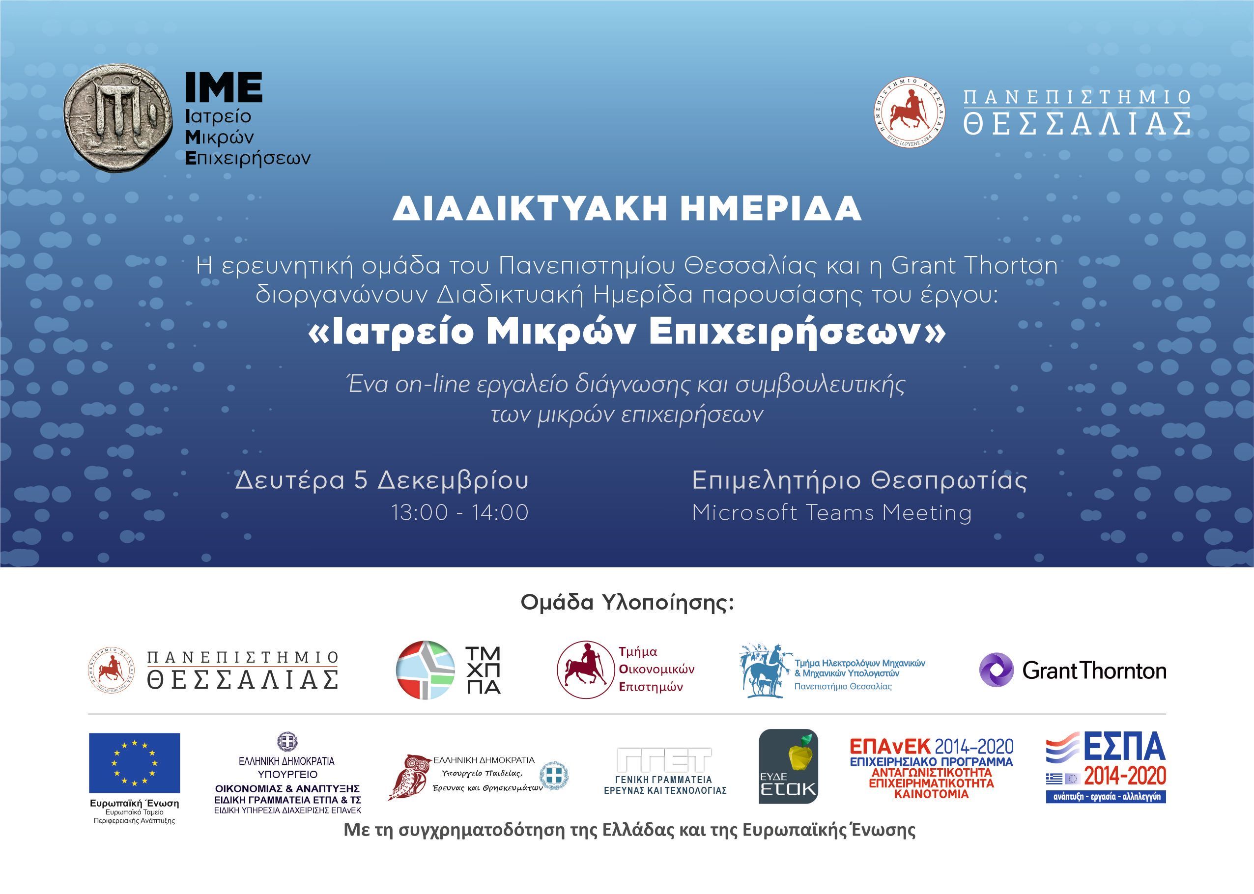Το Επιμελητήριο Θεσπρωτίας ενημερώνει ότι την Δευτέρα, 5 Δεκεμβρίου 2022, στις 13:00 θα πραγματοποιηθεί η Διαδικτυακή Παρουσίαση του Ερευνητικού Έργου με τίτλο “Ιατρείο Μικρών Επιχειρήσεων - IME”.