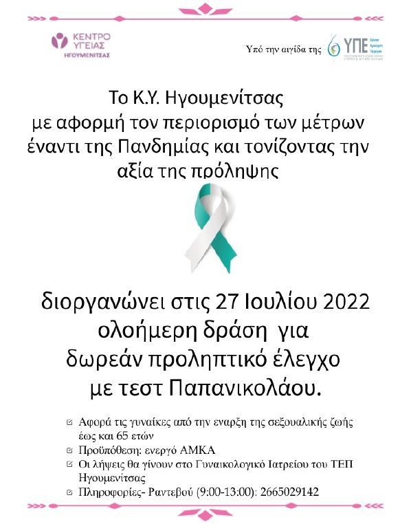 Με αφορμή τον περιορισμό των μέτρων για την πανδημία και τονίζοντας την αξία της πρόληψης που παραμελήθηκε στα χρόνια της Πανδημίας, το Κ.Υ. Ηγουμενίτσας πραγματοποιεί δράση για την πρόληψη του καρκίνου του τραχήλου της μήτρας με τη δωρεάν λήψη Τεστ Παπανικολάου. Η δράση θα λάβει χώρα στις 27/7/2022 και η λήψη των Τεστ θα γίνεται στο ΓΥΝΑΙΚΟΛΟΓΙΚΟ ΙΑΤΡΕΙΟ του ΤΕΠ Ηγουμενίτσας από τις 9:00 το πρωί έως τις 8:00 το βράδυ μετά από δήλωση συμμετοχής.