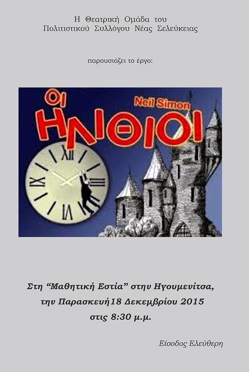 Πολιτιστικός Σύλλογος Νέας Σελεύκειας_Πρόσκληση σε θεατρική παράσταση "Οι Ηλίθιοι" του Νιλ Σάιμον_ Παρασκευή 18.12.2015 και ώρα 8.30 μ.μ._Χώρος εκδηλώσεων πρώην Μαθητικής Εστίας, Ηγουμενίτσα.