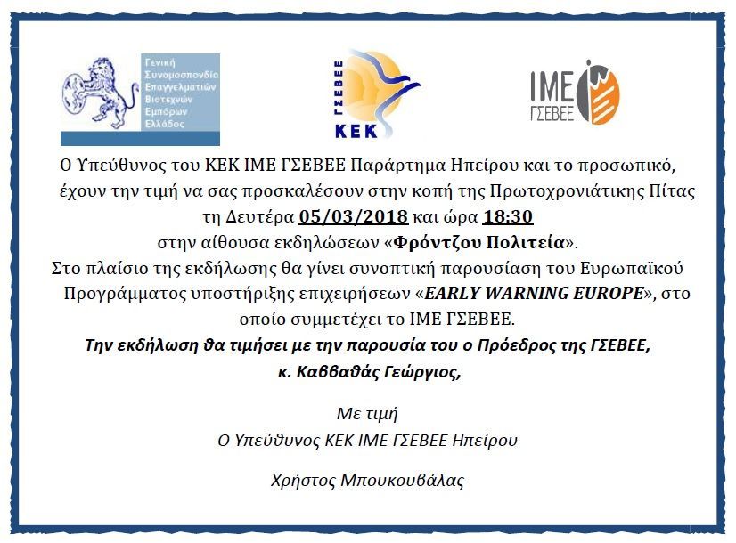 ΚΕΚ ΓΣΕΒΕΕ_Πρόσκληση σε εκδήλωση της ΓΣΕΕΒΕ - Κοπή Πρωτοχρονιάτικης Πίτας & Παρουσίαση Ευρωπαϊκού Προγράμματος υποστήριξης επιχειρήσεων "EARLY WARNING EUROPE"_Ιωάννινα_05.03.2018