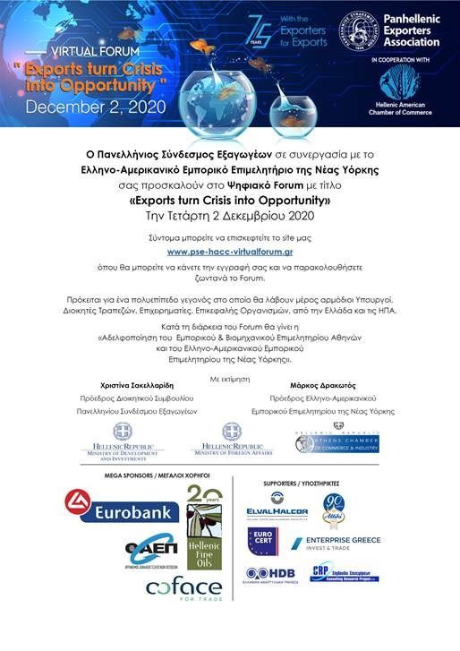 Ο Πανελλήνιος Σύνδεσμος Εξαγωγέων σε συνεργασία με το Ελληνο-Αμερικανικό Εμπορικό Επιμελητήριο της Νέας Υόρκης σας προσκαλούν στο Ψηφιακό Forum με τίτλο «Exports turn Crisis into Opportunity» Την Τετάρτη 2 Δεκεμβρίου 2020