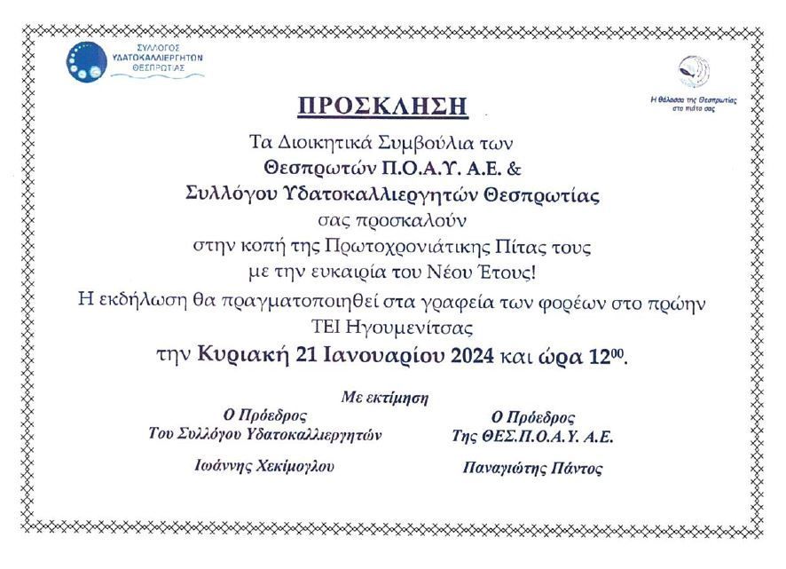 Πρόσκληση Συλλογου Υδατοκαλλιεργητών Θεσπρωτίας και Θεσπρωτών Π.Ο.Α.Υ Α.Ε στην κοπή της Πρωτοχρονιάτικης Πίτας_Πρώην ΤΕΙ Ηγουμενίτσας_21.01.2024