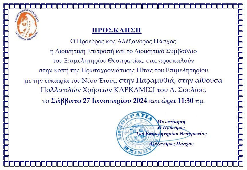 Πρόσκληση στην κοπή της Πρωτοχρονιάτικης Πίτας του Επιμελητηρίου_Αίθουσα Πολλαπλών Χρήσεων ΚΑΡΚΑΜΙΣΙ, Παραμυθιά_27.01.2024 και ώρα 11:30