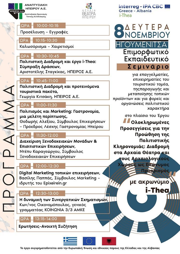 Ο Αναπτυξιακός Οργανισμός «ΗΠΕΙΡΟΣ ΑΕ», Φορέας Λειτουργίας της Πολιτιστικής Διαδρομής στα Αρχαία Θέατρα της Ηπείρου, διοργανώνει Επιμορφωτικό-Εκπαιδευτικό σεμινάριο για επαγγελματίες-επιχειρηματίες του τουρισμού, της παραγωγής και μεταποίησης τοπικών προϊόντων και για φορείς και οργανώσεις πολιτιστικού χαρακτήρα την Δευτέρα, 8 Νοεμβρίου 2021 στην Ηγουμενίτσα (Πάνθεον Πολιτιστικό Πνευματικό Κέντρο).