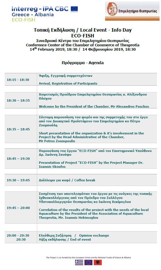 Στα πλαίσια του προγράμματος ECO-FISH, το Επιμελητήριο Θεσπρωτίας σε συνεργασία με τον Επιστημονικό Υπεύθυνο του έργου Δρ. Ιωάννη Σκούφο, προσκαλεί τις επιχειρήσεις του Νομού που δραστηριοποιούνται στον κλάδο των ιχθυοκαλλιεργειών, στην Τοπική Εκδήλωση / Ημερίδα Ενημέρωσης που διοργανώνει με θέμα: