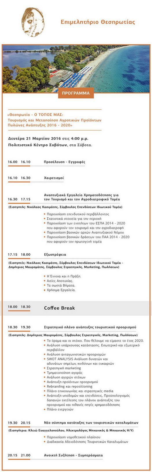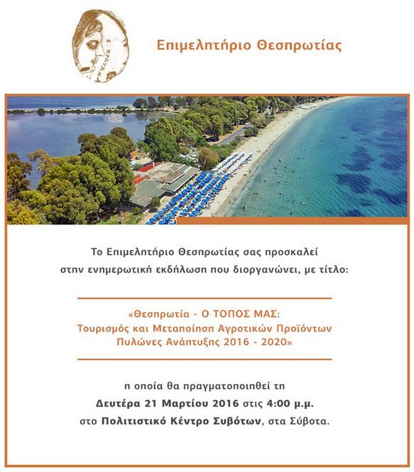 Ενημερωτική Εκδήλωση:Θεσπρωτία - Ο ΤΟΠΟΣ ΜΑΣ: Τουρισμός και Μεταποίηση Αγροτικών Προϊόντων Πυλώνες Ανάπτυξης 2016 - 2020_Πολιτιστικό Κέντρο Συβότων_Δευτέρα 21 Μαρτίου 2016