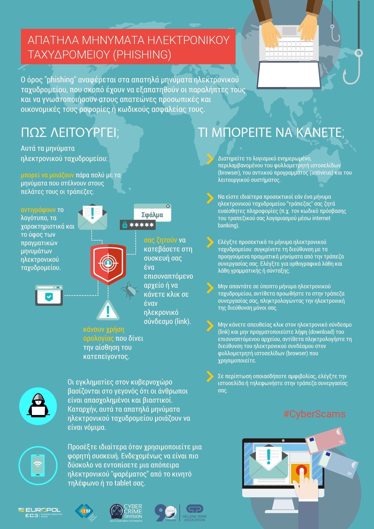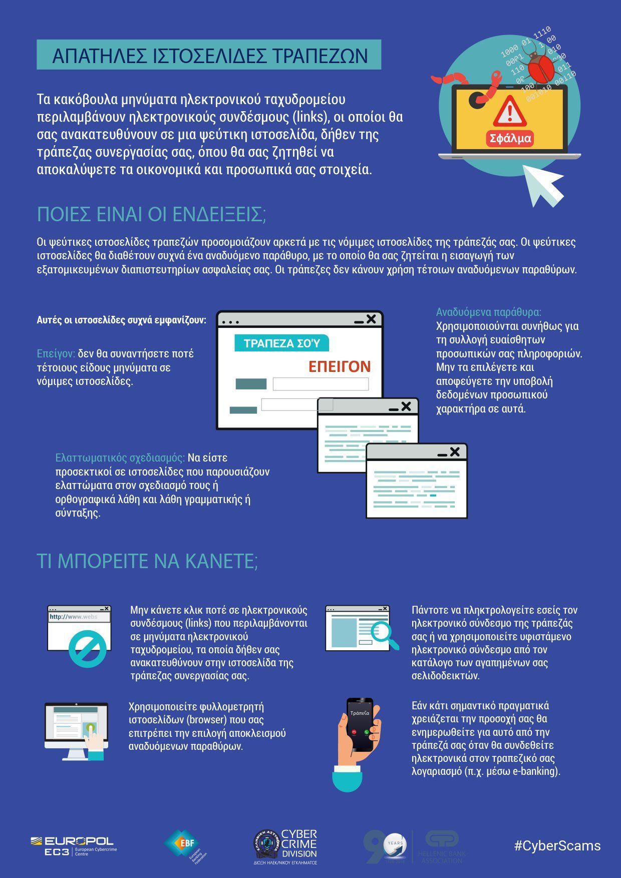 - Να μη συμπληρώνουν στοιχεία πρόσβασης τραπεζικών λογαριασμών σε φόρμες που τους αποστέλλονται από ηλεκτρονικές διευθύνσεις ή μηνύματα,